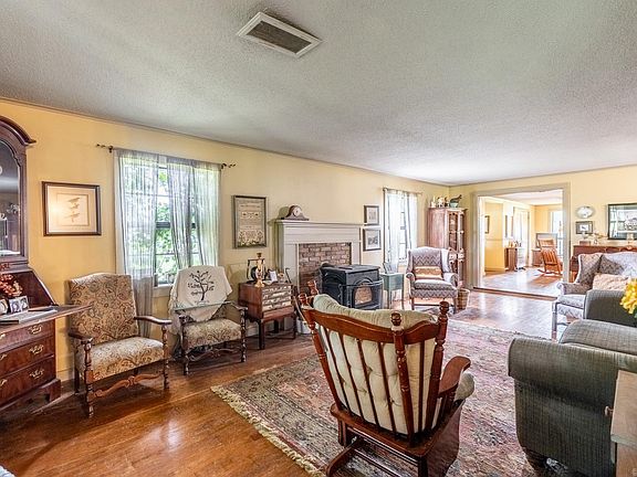 Breathtaking Views! Nestled on 75 acres of beautiful mature trees with two serene ponds, this beautiful property offers the perfect blend of natural beauty and comfortable living. Boasting 4 bedrooms and an office that can serve as a 5th bedroom, this home includes 3 full bathrooms and 3,568 square feet of living space. Inside, you'll find two large living areas, one with a cozy fireplace and the other with a charming woodburning stove, along with a separate dining room. The kitchen offers ample counter space & cabinets, a walk-in pantry, and an included refrigerator. The spacious primary en suite features two huge walk-in closets, providing plenty of storage. Enjoy peaceful mornings on the screened-in front porch and relax in the evenings on the spacious back patio. The property includes a shop with electricity, perfect for hobbyists, and a barn with electricity and stables ready for horses. Recent updates include a NEW roof (Sept. 2023), NEWER carpet, NEWER water heater, and NEWER HVAC. Additionally, the property is eligible for a Rural Development Loan with no money down. Don't miss out on this beautiful, one-of-a-kind property! Agents see remarks.