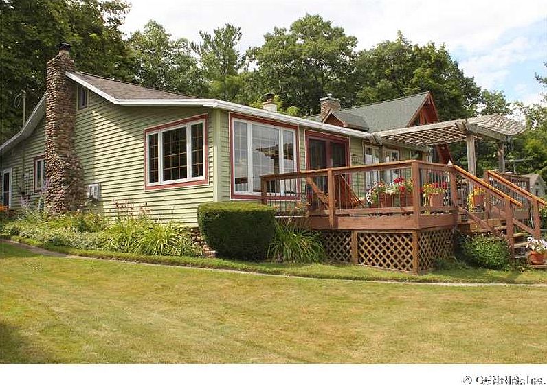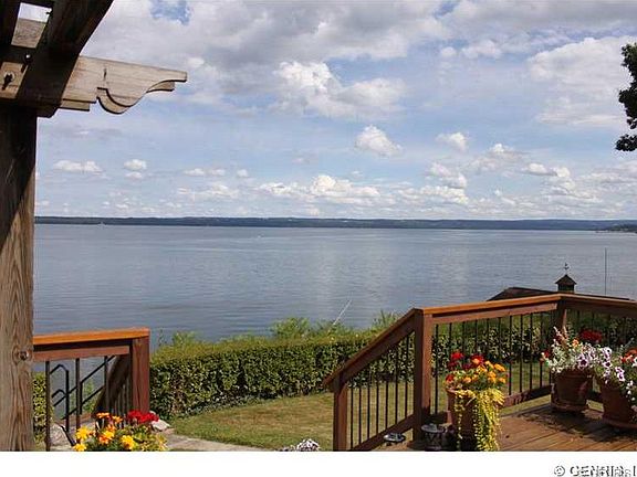 Enjoy the beautiful panoramic views off your open deck w Pergala. 70' of Seneca Lake Front. Beautiful open layout turnkey two bedroom home could easily be 3 bedroom. Additional finished loft area also used as a bedroom. Lots of glass for gorgeous lake views. 1.5 baths, newer roof, windows, doors, electrical, drywall, updated plumbing, new fireplace, furnace,flooring,bathrooms.Dock w deck & cement seawall. Lg Boat House Trolley for pulling your vessel into the boat house w cement floor & storage area. One car detached garage, plenty of parking area with additional yard on west side of road.