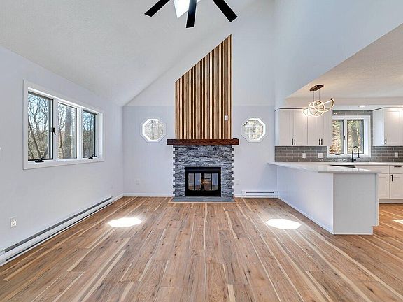 Property is under contract and only receiving back-up offers at this time. Welcome to this newly renovated, stunning 3-bedroom, 2-bathroom home, offering 1,400 square feet of modern living space and situated in a prime location with water views and lake life just steps away! This home has undergone a complete transformation, leaving no detail untouched. From the moment you step inside, you'll be captivated by the spacious, open floor plan and contemporary style that flows seamlessly throughout the home. The living room features a striking stone and wood slat fireplace, creating a warm and inviting atmosphere, perfect for cozy evenings. Large windows allow natural light to pour in, highlighting the soaring vaulted ceilings and skylights that enhance the sense of space and openness. The heart of the home is the sleek, eat-in kitchen, equipped with top-of-the-line stainless steel appliances, quartz countertops, and modern finishes that elevate the design. Whether you're preparing a meal or hosting friends, the kitchen offers both style and functionality. The bathrooms have been beautifully modernized, with clean lines, contemporary fixtures, and luxurious touches. Each of the three spacious bedrooms offers comfort and privacy, with ample room for relaxation. Enjoy outdoor living with expansive Trex decking in both the front and back of the home, providing plenty of space for gatherings or simply soaking in the natural beauty of the Pocono Mountains. The home is nestled within an amenity-packed community, perfect for those who love outdoor adventures and exploring local attractions. Whether you're hiking, skiing, or simply taking in the stunning surroundings, this location offers endless opportunities for adventure. Additional features include a new roof, exceptionally tall crawlspace with a vapor barrier, and a level of attention to detail and craftsmanship that is sure to impress. This home is a true masterpiece, offering the perfect blend of modern living, natural