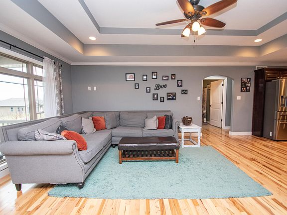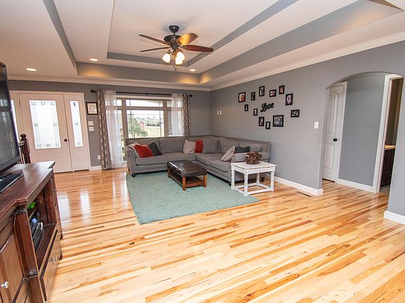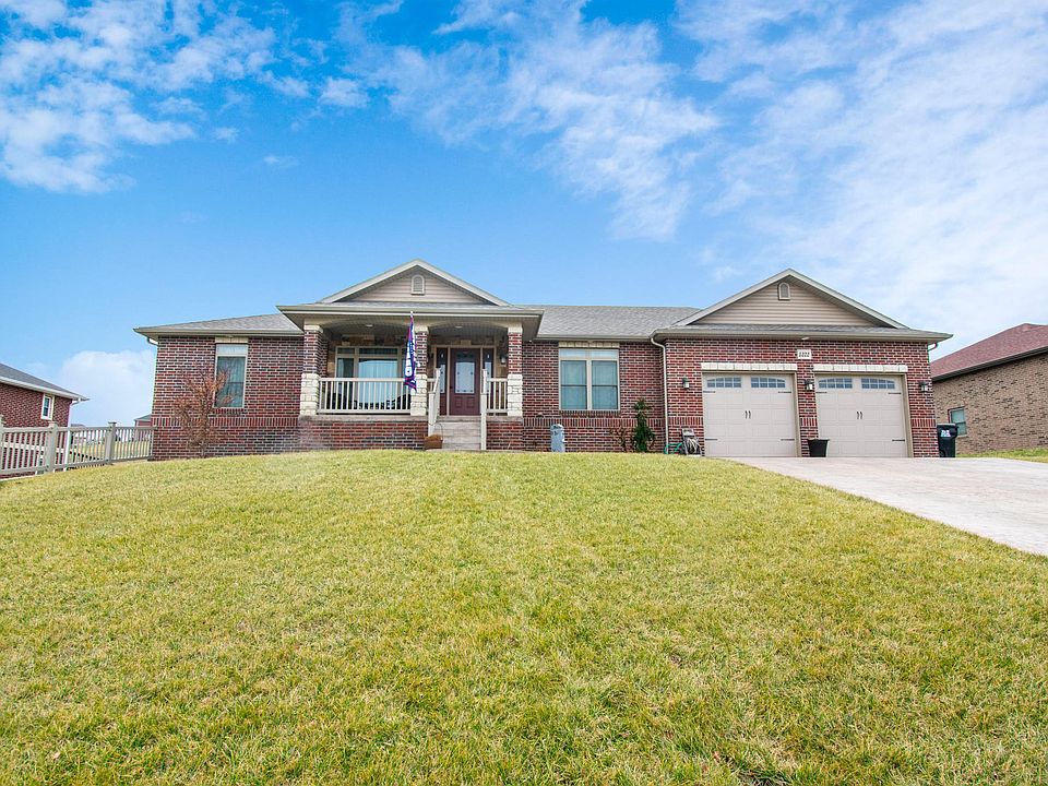 Gleaming hickory floors display a beautifully open living room with coffered ceilings. Rich cabinetry, granite countertops, a large island, & stainless steel appliances of the designer kitchen inspire home cooked meals & time spent with family. The expansive living space continues w/ a spacious office or main level family rm w/ fireplace plus a wonderful sunroom/bonus rm with tongue & groove ceiling. The split bedroom design offers privacy to the master suite w/ a fabulous dual head tiled shower. The entertainer's basement features an oversized family rm with wet bar, a media room, 4th bdrm, bath, & private patio. The 3rd garage &extra storage keeps life organized. Located on a quiet street in Blair Oaks school district, this is the home you have been searching for.