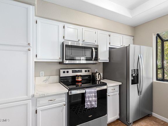 Centrally located community with dive in pool and hot tub and nicely shaded grassy area with trees perfect for a stroll around the area. Recently remodeled home wit new paint, quartz countertops with all stainless steel appliances included, and your very own fireplace! One of the few condos with an attached garage and private balcony. Close to the 60 and I-10. Plenty of shopping and dining nearby.