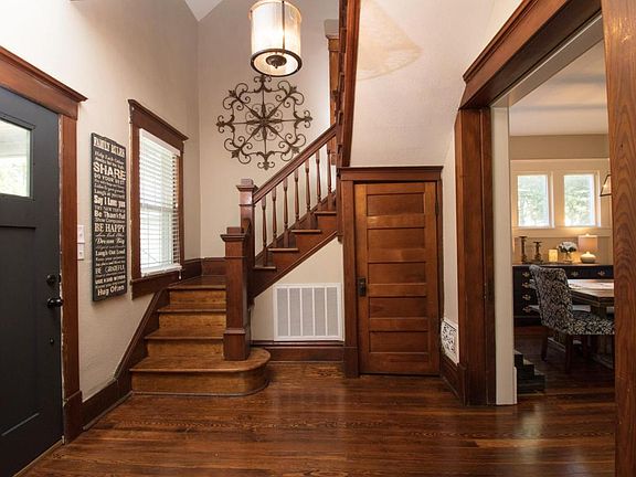 Abundant Charm and Character throughout. Completely remodeled and updated. Fantastic refinished hardwoods throughout. Entry foyer with original pocket doors. Living room with ornamental fireplace and built in book cases. Formal dining room. Remodeled kitchen with new cabinets, high definition counter tops, tile back splash and stainless front Kenmore appliances including refrigerator. Main floor master suite with new bathroom that includes new custom cabinets, onyx countertop, and 3x5 custom polystone walk in shower. Upstairs 3 bedrooms and remodeled bath with custom cabinets and onyx countertop. New Pex plumbing throughout. New hot water heater and Delta plumbing fixtures. New Low E Argon filled windows. New insulation blown in attic, entire interior and exterior repainted, met