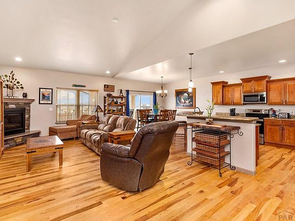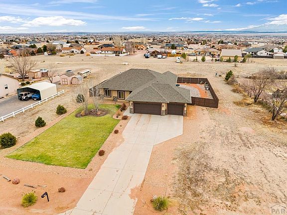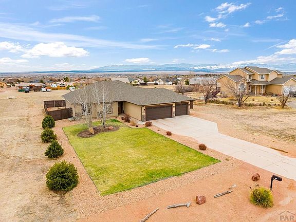 Luxury Awaits you in this beautiful Pueblo West rancher. Discover your dream home in vibrant Pueblo West. This stunning 3681 sq ft home combines durable construction with elegant design. Step inside to find hardwood floors and an open floor plan, setting the stage for comfort and style. Three spacious bedrooms and two immaculate bathrooms offer relaxation and convenience. The heart of the home is the expansive kitchen, dry bar and living area, perfect for culinary adventures and making memories. Large primary suite with coved ceilings and beautiful natural light. Indulge in luxury with a jetted tub in the primary bath, split vanities and large walk-in shower. Enjoy the natural gas fireplace, central air cooling, alongside double-pane windows for energy efficiency and natural light. Walk out to the covered patio with the amazing 360 degree view of the mountains with a privacy fence and nice landscape front and back. An unfinished basement awaits your vision to finish as you wish. Home offers a large 3 car garage. Nestled in Pueblo West, enjoy proximity to the Pueblo Reservoir, great restaurants, schools, and outdoor recreation. Live in luxury, comfort, and convenience. Your dream lifestyle starts here. Welcome home!