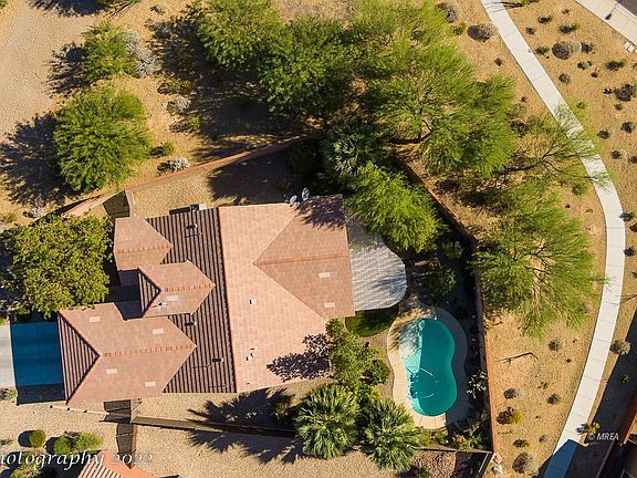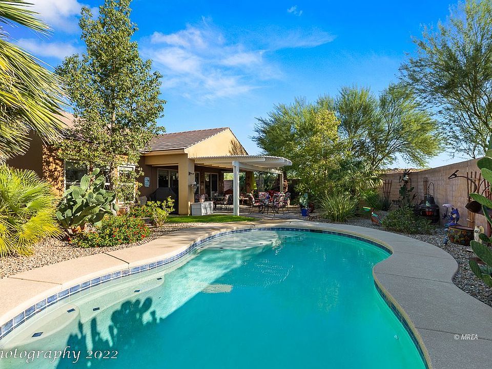 AMAZING OUTDOOR SPACE! Located on nearly a quarter acre, this Sun City home is situated on a premium homesite with a private swimming pool. The fully fenced backyard boasts a mountain view and the mature landscaping is gorgeous and appreciated. The orientation is ideal for year round outdoor use and the additional pergola & costly solar shades provide privacy and perfect spaces to entertain. This popular model is tastefully appointed with diagonal lay tile, neutral paint tones and the NEW AC unit is a bonus! Large picture windows immediately showcase the remarkable outdoors & a spacious kitchen island covered w/granite opens the kitchen up to the great room. Maple cabinets with pull out shelving and stainless appliances accent the kitchen (refrigerator included). The den/office is tucked away and the bedrooms are on opposite sides of the home ensuring privacy. The Owner's suite shows off new tile flooring & the ensuite hosts duel sinks, large soaking tub, walk-in in shower and spacious closet. Move in ready with a water softener, RO, ceiling fans & window coverings. Additional cabinets line the laundry room & the washer/dryer are included. Famous Del Webb amenities appreciated.