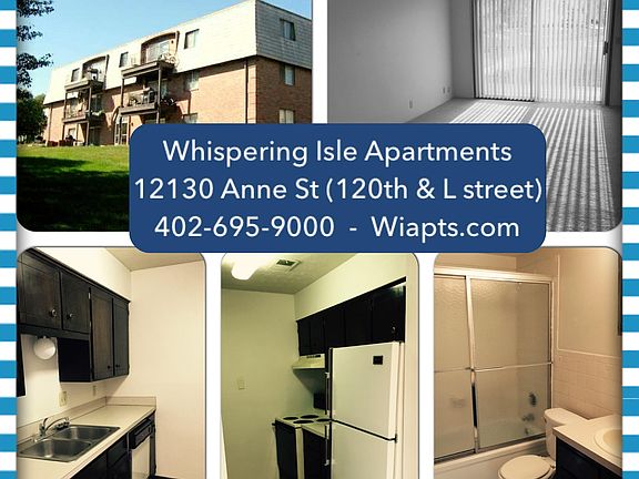 Great Location 122nd & L St (West of Famous Dave's) Whispering Isle Apartments - 12230 Anne St, Omaha, NE 68137 Office hours: Monday - Sunday - 9am - 7pm. Various floor plans. Rent starting at: $795 per month for One Bedroom(with One Bathroom) Heat & Water included. No Garbage fee. Across the street from Cheddars, Super Target, Home Depot, Walmart, Sams Club ... Spacious Apartments Millard school district. Garages Available Laundry Facilities in Each Building Central Air Conditioning Walk In Closets Fridge, Range, Dishwasher, Microwave, Garbage Disposal, Ceiling Fan Patio/Balcony Quick I-80/680 Interstate Access Great Location & Great Value. Call Us Today! Application fee $25 Rent includes water and heat. Tenant pays electricity. Application fee $25. Lease term 12 months. See office for more details