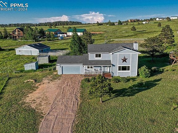 Discover the tranquility of rural living on this idyllic hobby farm nestled in the serene Black Forest area, just 20 minutes from I25/Interquest Parkway amenities. Spread across 5 acres, this property boasts barn, chicken coop, shed, regulation-sized dressage arena, and charming custom-built two-story home. The inviting country porch offers stunning Pikes Peak views, welcoming you into a spacious farmhouse retreat. Inside, the living room impresses with its generous size, featuring a cozy fireplace, ceiling fan, and a large picture window framing breathtaking mountain views. With four sizable bedrooms there's ample space for everyone. An expansive office w/ built-in bookcases provides an ideal home office or homeschooling area, eliminating the need for commuting. The recently updated kitchen showcases new appliances, sink, backsplash, and quartz countertops. A spacious pantry, breakfast bar, and a dining room with a walk-out to a large deck make indoor and outdoor entertaining effortless. The laundry room, complete with a laundry chute, is oversized and newly floored. Bedrooms feature charming details like chair-rail, wainscot, and ceiling fans. The primary suite boasts beautiful hardwood floors, extending into the adjoining bathroom, which includes a large vanity, shower, soaking tub, water closet, and a walk-in closet. The basement offers two potential living areas, rough-in bathroom and a wealth of opportunity awaiting your personal touch. The property features oversized garage with workbench, playhouse for kids, loafing shed, chicken coop, and barn equipped with electricity & water. The barn includes tack room, feed room, five stalls, and three runs, complemented by a dressage arena and ample pasture for horses to roam freely (adjoining 5 acre parcel for sale). Extensive upgrades (transferable roof warranty) means the heavy lifting is done, giving the future buyer the ability to apply their own personal palette. Welcome to your quintessential country farmhouse!