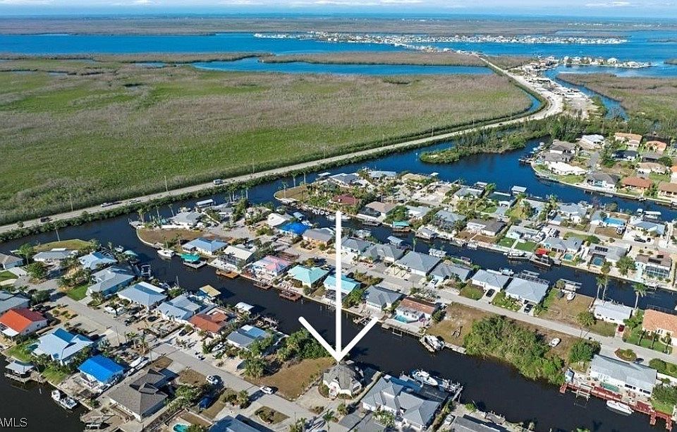 Matlacha Isles, sailboat/direct access to Matlacha Pass and then to the Gulf of Mexico. Build a beautiful new home-West exposure to maximize your sunsets with City Water and Sewer paid in full. The home is in need of repair/or tear down but the location is a premium lot with RSC-1 residential use. This is a 3 bedroom 2 bath, with the largest bedroom and bath downstairs and two bedrooms upstairs. Great room design. Building will go through the Lee County Building Department.