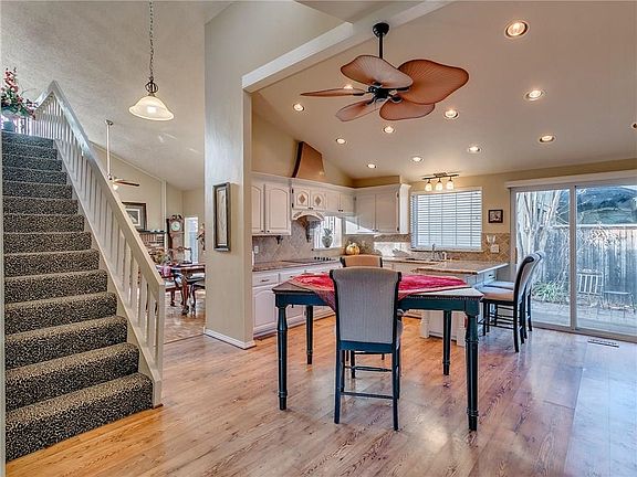 Located in the Arbors, this nicely updated home has granite counters in kitchen, a breakfast bar, and eat-in area. There are high ceilings in the living room and a fireplace. There is also a formal dining area with pass-through window to kitchen. There are 2 bedrooms downstairs and a full bath. You will be amazed at the upstairs master bedroom as it has wood flooring, a balcony, lots of storage, and an updated shower. There is also a storm shelter in the garage floor. For entertaining or relaxing there is a lovely patio in the back and also lots of space on the side for additional enjoyment. The HOA has 3 pools, and lots of walking places. Close to Hefner Lake, and Bluff Creek Park, shopping and restaurants. Easy access to highways. You will enjoy this spacious and up-dated home.