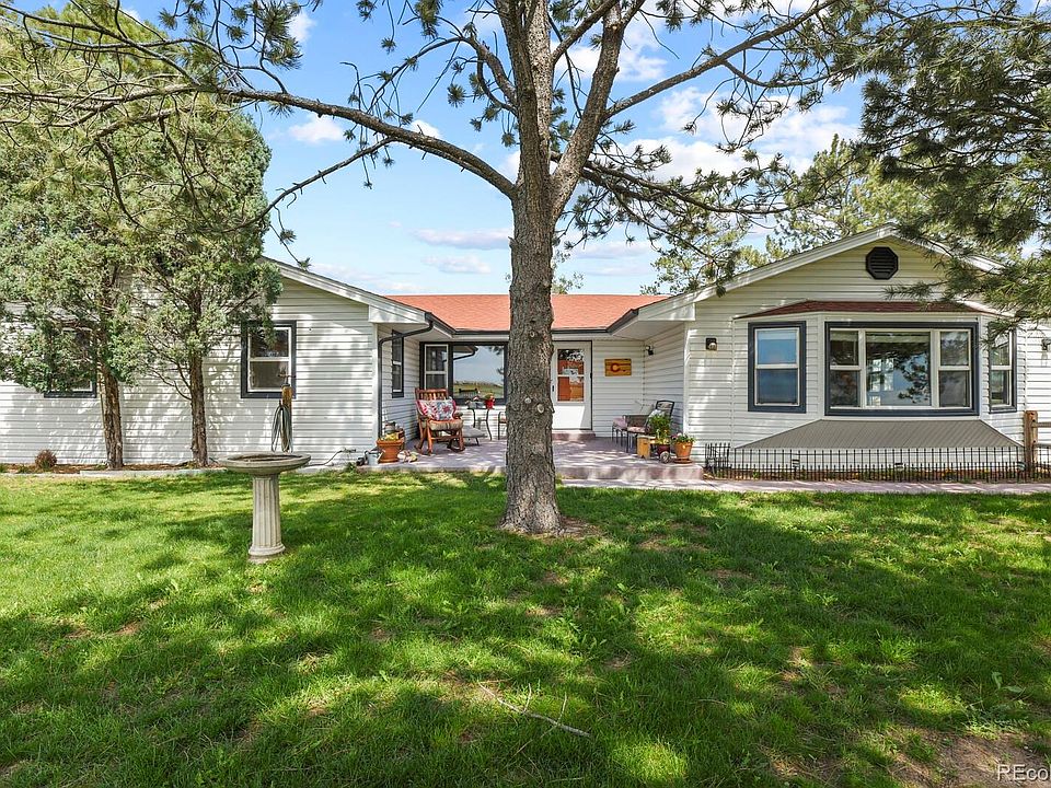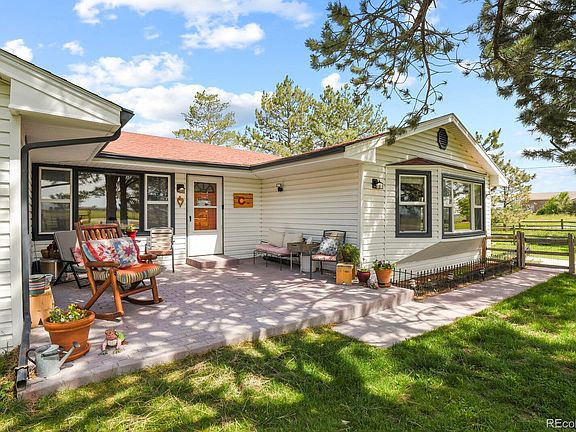 Two acres of country living right off Lincoln Parkway. Drive up on this circle driveway and be covered by a canopy of pine trees! This classic ranch styled home has a welcoming front porch to watch sunsets and listen to birds chirp. The home has been lovingly cared for and updated over the years. Formal living and dining rooms, expanded family room with a vaulted ceiling, natural gas fireplace and built in window seat. Three bedrooms and 2 bathrooms, plus an unfinished basement for storage or finish how you like. Kitchen has 42" upper cabinets, quartz countertops, brick backsplash, farm sink and an eat-in dining space. Newer hickory hardwood floors throughout the house with tile in the entry and kitchen areas. New furnace, A/C, humidifier and tankless water heater installed in 2021. Walkout the back door onto the covered patio overlooking the large backyard. Room for gardens, animals, toys, etc. The 2700 sq. ft. barn has electricity, wood burning stove, and 3-barn stalls for horses with dirt floors and access to fenced pasture right out the back. Concrete floor on the other 2/3rds of the barn great for storing tractors, hobbies, cars/trucks, etc. The 2nd story of the barn is a huge "hay loft" but it can be used for storage or another hobby space. Front of the house faces west and has the most amazing sunsets. Short drive to I-25 to commute to Denver, Tech Center, etc. Low taxes and voluntary HOA. This neighborhood is a gem!