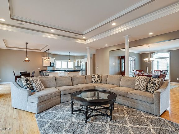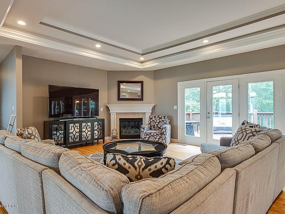 Welcome to your open-concept ranch floorplan on 1.26 acres in Oldham County! This home has been meticulously maintained and is move in ready. Just inside the beautiful entry door you'll find the formal dining room with gorgeous tray ceilings. An impressive wall of windows connects you with the outdoors and offers a scenic view from nearly every angle. Strategic recessed lighting throughout the main floor enhances the abundance of natural light. The open plan facilitates a great flow for both everyday living and entertaining. You'll fall in love with the farm-style chandelier in the breakfast area and matching pendant lighting over the kitchen island. The gourmet kitchen offers plentiful cabinetry and counter space in addition to a dedicated pantry.