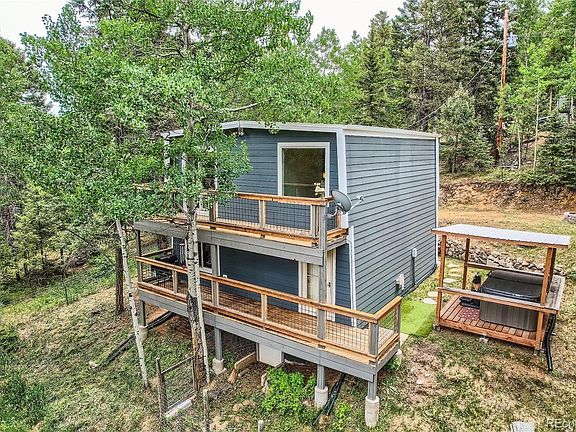 Nestled in the serene mountains, this charming 2-bedroom, 2-bathroom home offers the perfect retreat for those seeking tranquility and natural beauty. Well maintained and move-in ready, this cozy abode welcomes you with an inviting atmosphere and picturesque surroundings. The exterior has low maintenance cement board siding and the interior has fresh paint. The living area features a pellet stove to keep the space cozy and heating bills low. The kitchen, equipped with modern appliances and ample counter space, is ideal for preparing delicious meals. Both bedrooms provide comfortable accommodations, with a shared bathroom and laundry space upstairs as well. The second main level bathroom, equally well-appointed, serves both guests and residents alike. There are options for enjoying the fresh mountain air, starting with the two levels of decks, accessible from the family room and bedroom upstairs. Step outside to discover the ultimate relaxation spot: a private hot tub (included in sale!), perfect for unwinding after a day of mountain adventures. Gather around the fire pit with friends and family, creating lasting memories under the starlit sky. The septic system has been pumped and passed inspection and the domestic well offers options for having animals on the property. The roomy shed offers a secure place to store your outdoor adventure gear, such as skis and bikes. Surrounded by nature, this home offers easy access to hiking trails at Jeffco Open Space Parks and nearby Staunton State Park, scenic views, and outdoor activities. Whether you're looking for a peaceful weekend getaway or a permanent mountain residence, this delightful property has everything you need to enjoy the best of mountain living. Don't miss the opportunity to make this idyllic home yours!