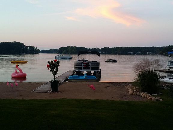 Spectacular lakefront ranch on Pine Lake #4! This 4 BR, 3 BA walkout is certainly a stunner. Gourmet granite kitchen with Hickory floors & stainless appliances. The large island adds extra counter space while cooking & entertaining. Two stone fireplaces (one in formal living room; the other on the walkout level) keep your toes toasty on those cold winter mornings! Main floor master comes with private bath. Two additional bedrooms, a guest bath plus laundry and mudroom complete this level. Lower walkout level boasts second master bedroom suite with private bath, all overlooking the lake. Breathtaking sunrises from an expansive rear deck with clear glass panels allowing for an obstruction-free view. The backyard, gently sloping towards the sandy beach with no stairs to water. Dock