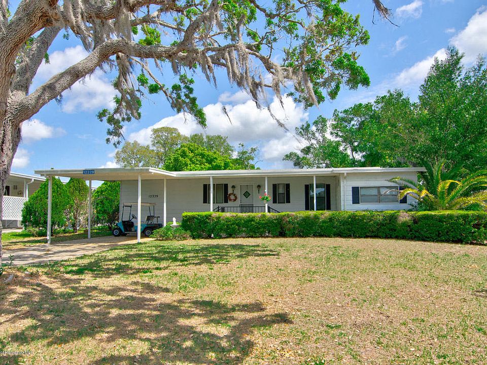 Come sit in this park-like backyard that offers an unprecedented, panoramic vista of High Point Golf Club's most challenging Par 3 hole. Whether you are sitting in your enormous Florida Room, under your covered lanai, or at your picnic table you have a perfect, CLOSE-UP VIEW of the #3 GREEN. Take your time to soak it all in. This is a 1475 square foot 2/2 golf course home oriented lengthwise on a large lot. Featuring spacious kitchen, living room and an extra large master bedroom suite with walk-in closets. Large utility room. Located in popular 55+ community where you own your own land. Community amenities include tennis, heated pool, horseshoes, bocce, community center, pickle ball and more. Located near major medical facilities, shopping and restaurants.