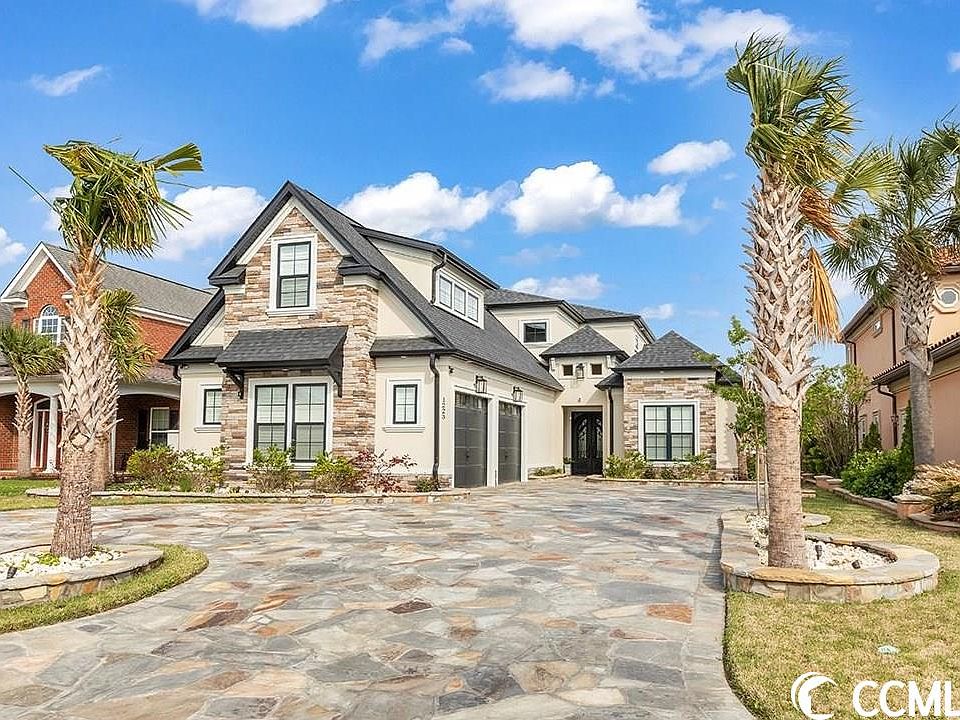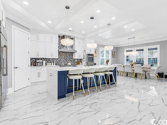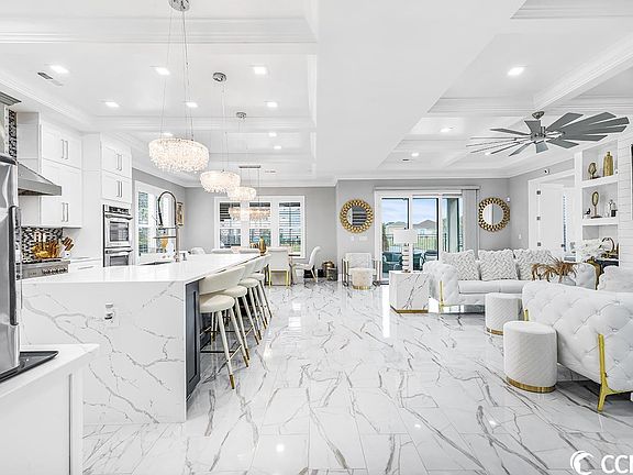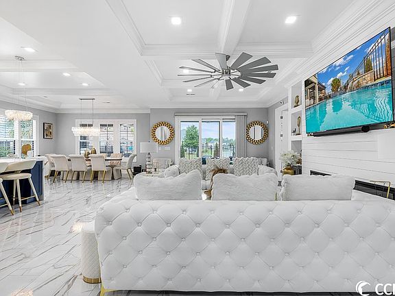 This “WOW!” kitchen features upgraded appliances and cabinets, glistening quartz countertops, designer backsplash, farmhouse sink, pantry with quartz shelving and backsplash, and incredible crystal chandelier lighting. The stunning living-dining area, with beautiful white porcelain tile flooring, has a stylish electric linear fireplace, crystal dining chandelier, plantation shutters, recessed lighting, coffered 10-foot ceilings, and exquisite trim work. The master suite includes custom his and her walk-in closets to accommodate any wardrobe, and an exciting and jaw-dropping master bathroom with upgraded mirrors, fixtures, zero-entry tile shower, and spa tub. Two well-appointed wet bars, one upstairs and one downstairs, add beauty and livability. The large laundry room, with quartz countertop, laundry sink, and cabinets galore, includes a top-of-the-line washer and dryer. In addition to the master suite, there is a second bedroom suite downstairs with its own attractive bathroom and walk-in closet, plus a well- appointed half-bath/powder room, and 8-foot doors and cased openings that add to the spacious and majestic feel of this richly-adorned home. A large second living area upstairs has its own wet bar as noted, plus two generous bedrooms, plush bathroom, and a gigantic unfinished room that can store a household of goods or be converted to more living space. Whole-house upgrades include the porcelain tile flooring throughout and all fixtures, hardware, and lighting. The garage features custom stonework flooring and ceiling fans that provide a showroom look for your cars or your workspace, an additional freezer will help you feed all the friends and guests you will want to entertain in your new Myrtle Beach mansion. Generous glass surfaces at the rear of the home bring the beautiful indoor and outdoor spaces together, including the covered outdoor kitchen and covered seating area with gas fireplace. The saltwater pool with more custom stonework is designed with a natural aesthetic and includes a waterfall feature that adds to the relaxing atmosphere. To enhance your outdoor experience, retractable screens can be easily lowered or raised to create a comfortable, bug-free environment. With a touch of a button, you can open or close the retractable screens and the awning over the outdoor kitchen to better enjoy your perfect outdoor relaxation and entertainment area. And to make your move-in easier and start your ideal beach living faster, all of the many wall-mounted TV’s in the home remain—including their surround sound speakers where installed. Other furnishings in the homes are not included in the sale but are negotiable.