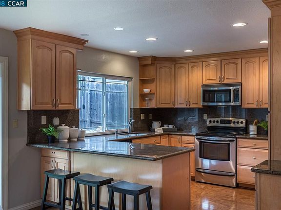 Fantastic single- story home located on a corner lot in Turtle Creek. Spacious layout with a huge open living room, vaulted ceilings and connected formal dining area. Sizable open concept kitchen and family room combo. Kitchen with breakfast bar, granite, stainless-steel appliances, recessed lighting and ample storage space. Lovely views to the back yard from the kitchen window. Convenient indoor laundry with built-in cabinetry. Master bedroom with vaulted ceilings, a wall of closets and en-suite bath. Ceiling fans in almost every room. Step outside to the large backyard with green grass and patio area with extra seating along wall. Turtle Creek is a great neighborhood with green belts, community tennis courts and nearby trails. A dog park and bocce ball courts are just down the road at Newhall Park. Convenient location, less than 4 miles to BART and freeway access.