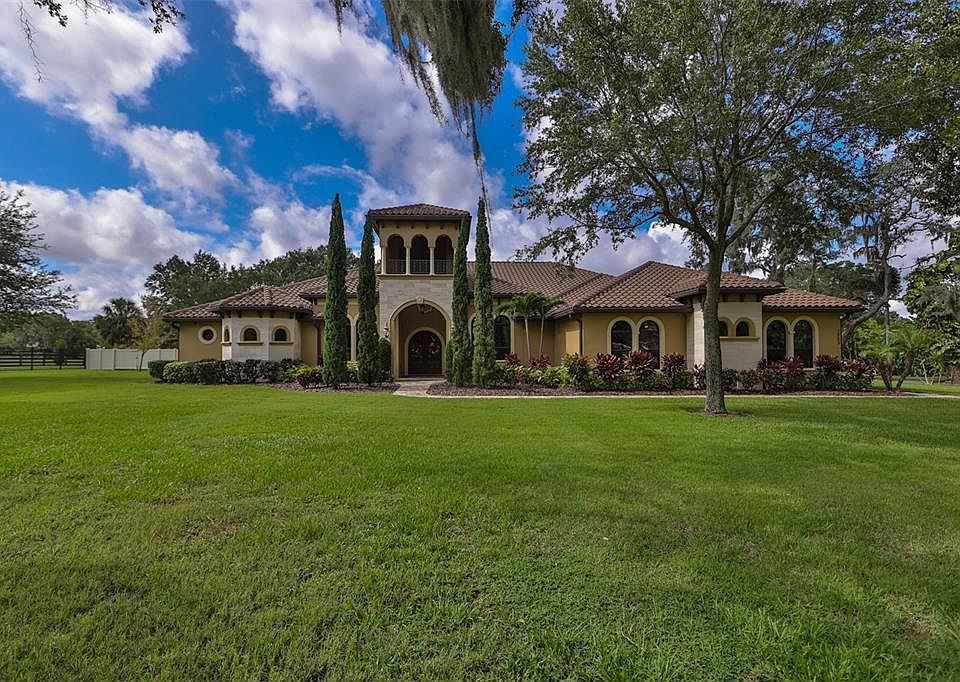 Proof of funds or Pre-Approval required prior to showing, You will fall in love with this Custom Mediterranean Estate on 2.7 acres. Must see, private gated driveway Property totally fenced. Beautiful oak trees. Non subdivision No Deed restrictions No Hoa!!! This custom home is very open with large rooms with walk in closets. Separate office, Beautiful salt water solar heated 17'x35' pool with jacuzzi, fountains, water spill overs and fire bowls. For the business person, you would have the privacy you need in the 2400 sq ft. office/shop/gym in separate building behind the residence on the back of the property. Also could be used for the collector of car's antiques or hobbyist. Plenty of room for the motorhome, garden, tree house, many choices here. The main home also has oversized 3 car garage. 2 Tankless water heaters, 2.74 Ac's, circle driveway, paver sidewalks, surround sound including pool and lanai area. This quiet private estate is 15 minutes to Tampa or 45 minutes to Orlando. Great school's