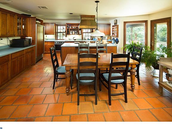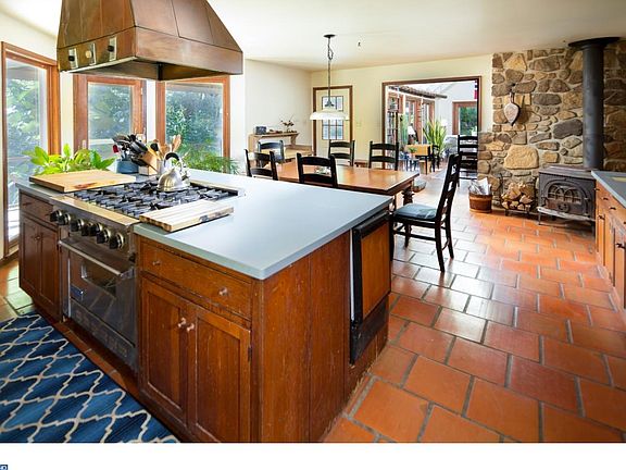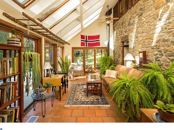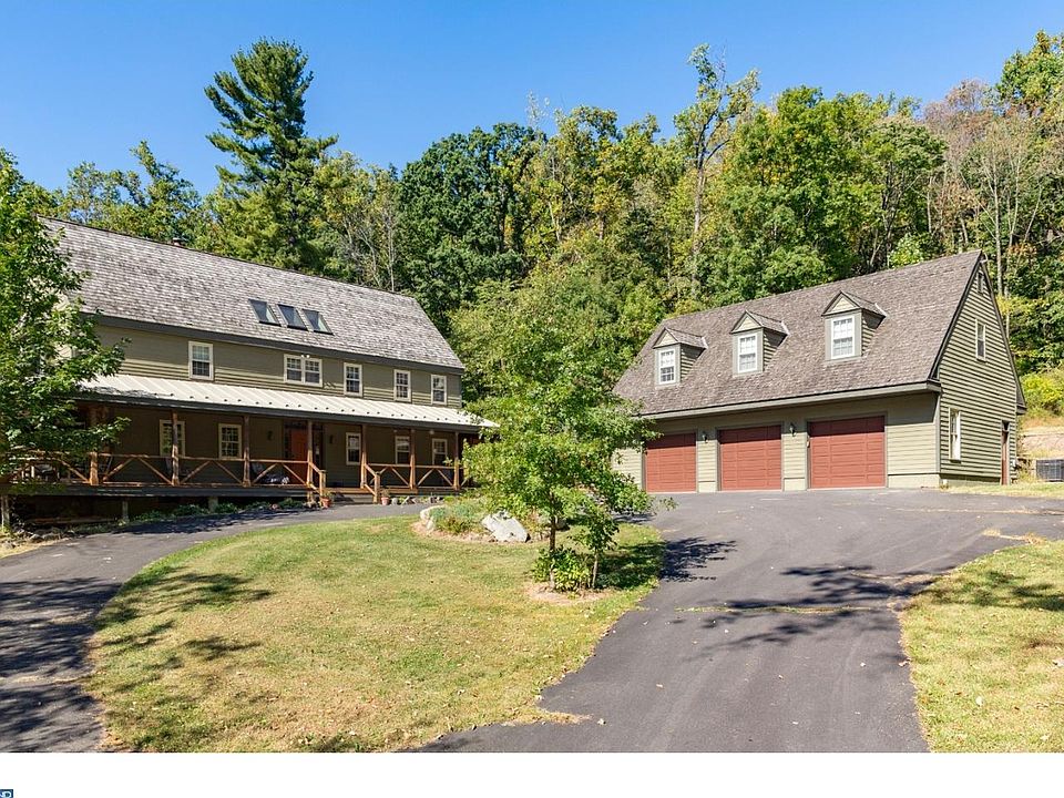 Enjoy privacy in this home situated on ten acres down a long driveway on Upper Makefield's Jericho Mtn. An original small 1700's stone structure has been transformed through additions into a spacious modern Farmhouse. One is greeted by a large wraparound front porch. From the entrance foyer the spacious open kitchen/breakfast room is to the left. The kitchen with tile floor has a large center island holding a 6 burner stove with copper hood above. In the corner of the breakfast room is a wood burning stove. There is a door from the kitchen to the wraparound porch. The kitchen/breakfast room is all open to a lovely sun room with tile floor, skylights, doors to a side patio, another wood burning stove and an inside stone wall of the original structure. On the other side of the stone wall is the dining room with original floors, beams, and fireplace. There is a mud room, powder room and all purpose room with wood floors and bar sink. On the second level is the master bedroom with doors to a porch and bath with a very large Jacuzzi, shower and walk-in closet. There are 2 other bedrooms and bath on this level. Another bedroom is on an upper level. A partial walkout basement contains the laundry facilities. It has a geothermal heating system and central air. A detached 3 car garage has an apartment above. A one year home warranty is included.