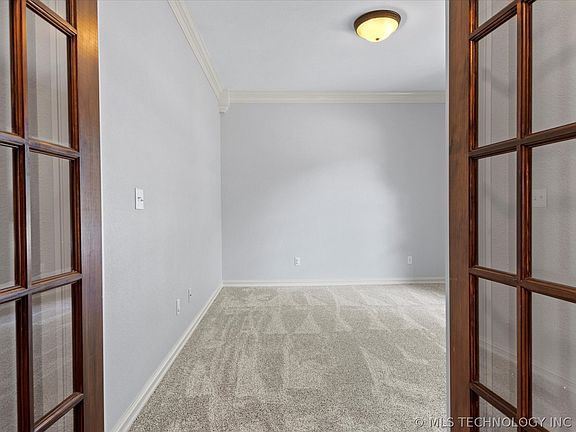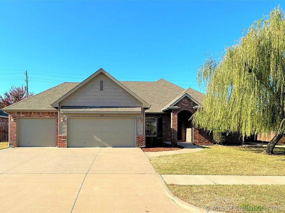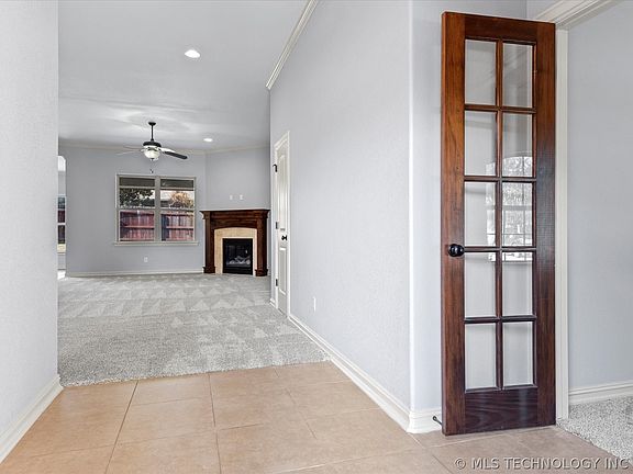 Desired location and wonderful open floor plan. Brand new interior paint and carpet set the stage for your decorative touch! 4th bedroom in front of home has glass french doors, could be used as separate office. Formal dining room with large, arched window. Kitchen with granite countertops, serving bar, and pantry, is open to breakfast nook and living area. Corner gas log fireplace in living room. Primary bedroom is separated and has tray ceiling, and exterior door to private patio. Ensuite luxury bathroom has separate shower, jetted tub, taller profile counters with double sinks, water closet, large walk-in closet, and lots of storage. Bedrooms 3 and 4 are separated from all others, and share a jack-and-jill bathroom. One covered and one private uncovered patio. Spacious laundry room has sink, and built-in folding area and storage cabinets. Half bath near laundry. 3 car garage is spacious, with transom glass block window on South, for added natural light.