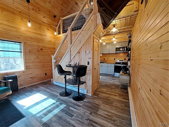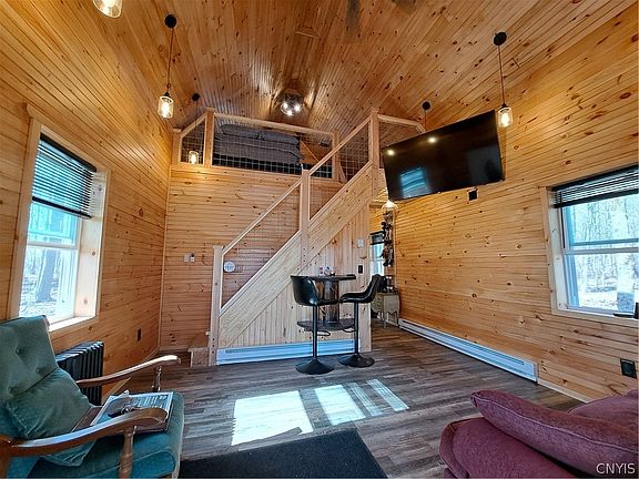 NEW Custom Built, Turnkey Tug Hill Year Round Cabin with so many unique features! What a great place to call home with an open rocking chair front porch, entry with coat closet & cozy living room w/ cathedral ceilings. There's a breakfast area w/ built in spool table for 2, step saver kitchen with plenty of modern painted wood cabinets, pantry closet & all appliances stay. A roomy full bath with walk in shower & utility storage closet. You will love the open stairway that leads to the generous upper loft bedroom with great views of the main level, back yard & surrounding woods. This is a super insulated energy efficient NEW home for year round living that has total electric baseboard heating for ultimate efficiency. Located just 15 minutes to the Village of Camden for everyday shopping. Recreation opportunities abound with Salmon "Redfield" Reservoir for fishing & boating, T. C Riders Snowmobile Trail on Graves Road, N.Y.S. State Forest land just up the street for several thousand acres to hunt, hike & enjoy nature. Catch salmon in Altmar & hundreds of miles of ATV trails in Oswego/Lewis Counties. Don't snooze on this one, neat as a pin, fully furnished & move in ready!