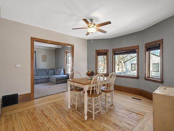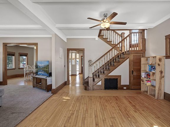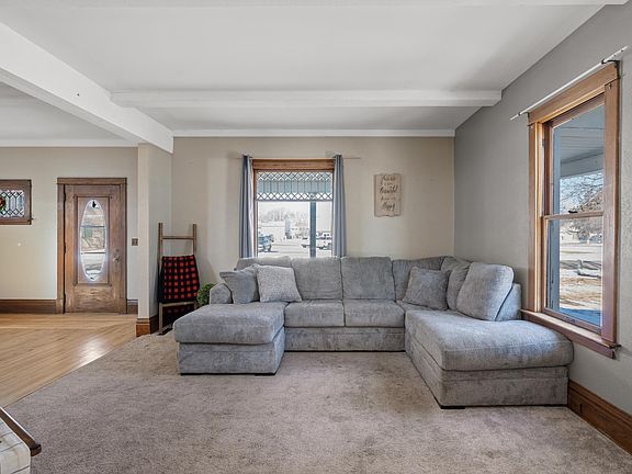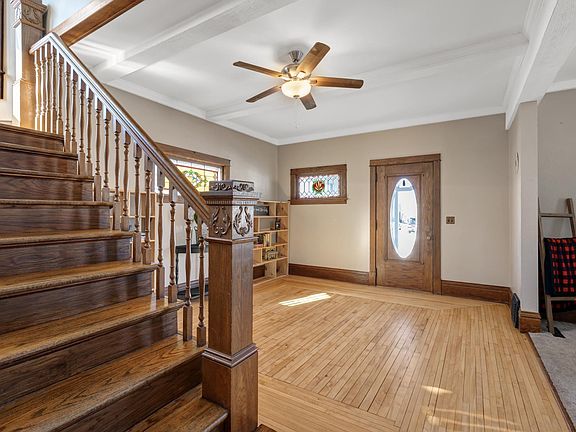 Check out this charming two-story home located in the heart of town! This property perfectly blends old-world charm with modern conveniences. The home is filled with original woodwork, including hardwood floors. You’ll find beautiful stained glass windows, adding to its character. You'll love the spacious feel of the tall ceilings and the abundance of natural light throughout. The kitchen features tall cabinets for extra storage. The open staircase leads to the upper level, where you'll find four bedrooms, full bathroom and washer and dryer. There is a washer/dryer hookup in the main-level bathroom, for potential 2nd laundry. Outside, enjoy a maintenance-free deck and the wraparound curved country porch, perfect for relaxing. And don’t forget the incredible 6-car drive-through garage—ideal for extra vehicles, toys, or yard equipment! New A/C and furnace installed in 2019. This home is truly a must-see! Schedule your showing today!