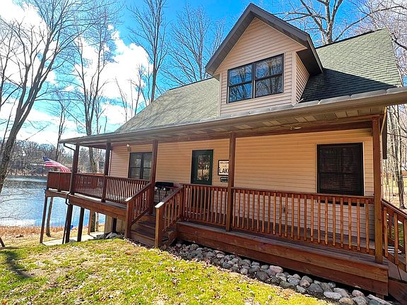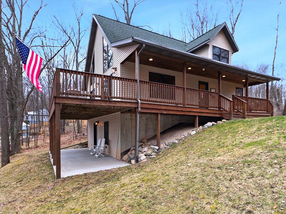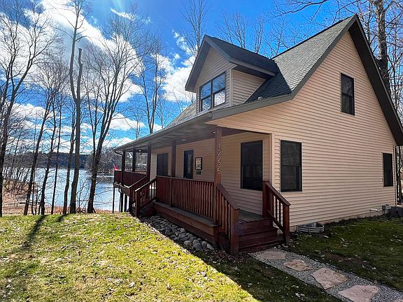 Stunning contemporary home awaits you, your family & friends for unlimited fun in the sun on All Sports Sunrise Lake! First let's talk about the amazing home; built in 2005 this newer construction 3bd/2 bath/2 living rooms needs nothing! When you arrive at the home you will be impressed w/the extensive wrap-around deck, w/sliders allowing you to step in to year round living & enjoyment of the wide open living space & loft. The trapezoid windows frame the picturesque view.... like a piece of art! Lower level family room walks out to new concrete patio. Approximately 3/4 of an acre w/100' of private waterfrontage, watch the kids play at the beach, swim, boat, fish or if you are a hunter there are nearly 12,000 acres for your enjoyment! PERFECT AIR BNB OR VR