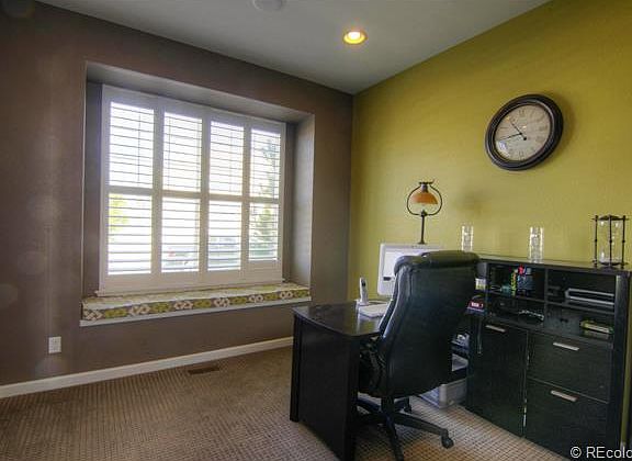 Fantastically well kept formal model home that shows pride of ownership. This home has a professionally landscaped fenced back yard with deck to enjoy the nice Colorado weather. Walk inside to the lovely Walnut floors throughout the main floor. Rich fireplace with an open floor plan and audio speakers throughout the house. Cook dinner in it's gourmet kitchen with double ovens and gas cook top. Don't miss out on this comfortable top of the line home. Backs to community park and easy commute to highway.