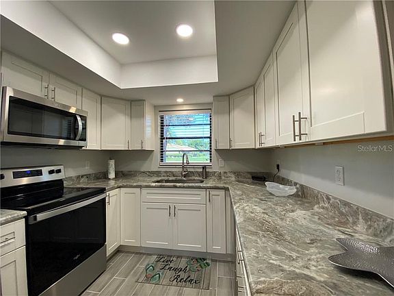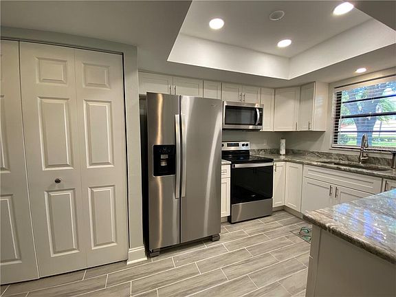 Easy to show. Immediate occupancy. Popular 55+ neighborhood Meadowcroft. This unit has been beautifully redone with new white kitchen cabinets, all new stainless appliances, gorgeous high-end granite, and tile floors through-out. This property features 2 master suites, each with a spacious walk-in closet. The living room/dining combo is spacious for when you have guests. Enjoy your Florida room with an extra storage closet. Let the breezes pass through into your livingroom. The patio area is perfect to soak up some sun and grilling. This active community has a heated pool, a great recreational center, tennis, shuffleboard, and enjoy walking over to the gazebo with wonderful lake views. The monthly condo fee includes cable, internet, water, sewer, landscaping, trash, exterior maintenance, and wonderful community features. New roof in the process of being installed on all units.