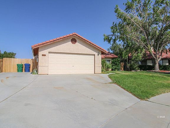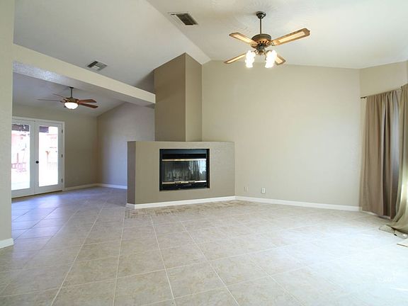 Cul-de-sac home with extended driveway and lawn. Tiled entryway into the living room with vaulted ceilings and fireplace. Tile flooring and vaulted ceilings carry over to the kitchen and dining room. Kitchen features wood cabinetry, tile countertops, updated track lighting and stainless steel stove, range hood and dishwasher. Dining room has a lighted ceiling fan and french glass doors to rear patio. Guest bedrooms have faux wood laminate flooring. Hall bathroom features solid surface vanity top, white cabinetry and tiled shower surround. Spacious master bedroom suite with high ceilings, lighted ceiling fan and french glass doors to rear patio. Hall storage cabinets. Shed. Tile roof. Evap. cooler on ground.