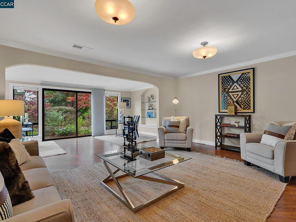 Nestled in a park-like setting, this special 3-bedroom, 3-bath townhouse in Rossmoor, Walnut Creek's sought-after over 55 community, offers an updated and expanded Piedmont model with a no-step entry and a layout reminiscent of a single-family home. The first floor features hard surface flooring, crown molding, and an open design connecting kitchen, dining & living areas. The patio has been converted to extra living space. The updated kitchen boasts granite countertops, mosaic-tiled backsplash & shaker-style cabinets A bedroom and full bathroom is conveniently located on this level. Upstairs, the primary en-suite offers a serene retreat with a gas fireplace, dual closets, and a balcony. Updated bathroom with dual sinks, oversized shower, and skylight. Another bedroom with an adjacent bathroom completes the upper level. Amenities include 3 pools, fitness center, golf courses, tennis, bocce, pickleball, and onsite restaurant. Enjoy trails, clubhouses, gardens & a library. Services include a computer center, handyman, counseling & cable/internet. Creative spaces like an art studio & woodworking shop A shuttle service enhances transportation within and outside the community, connecting to downtown Walnut Creek and BART for wider travel.