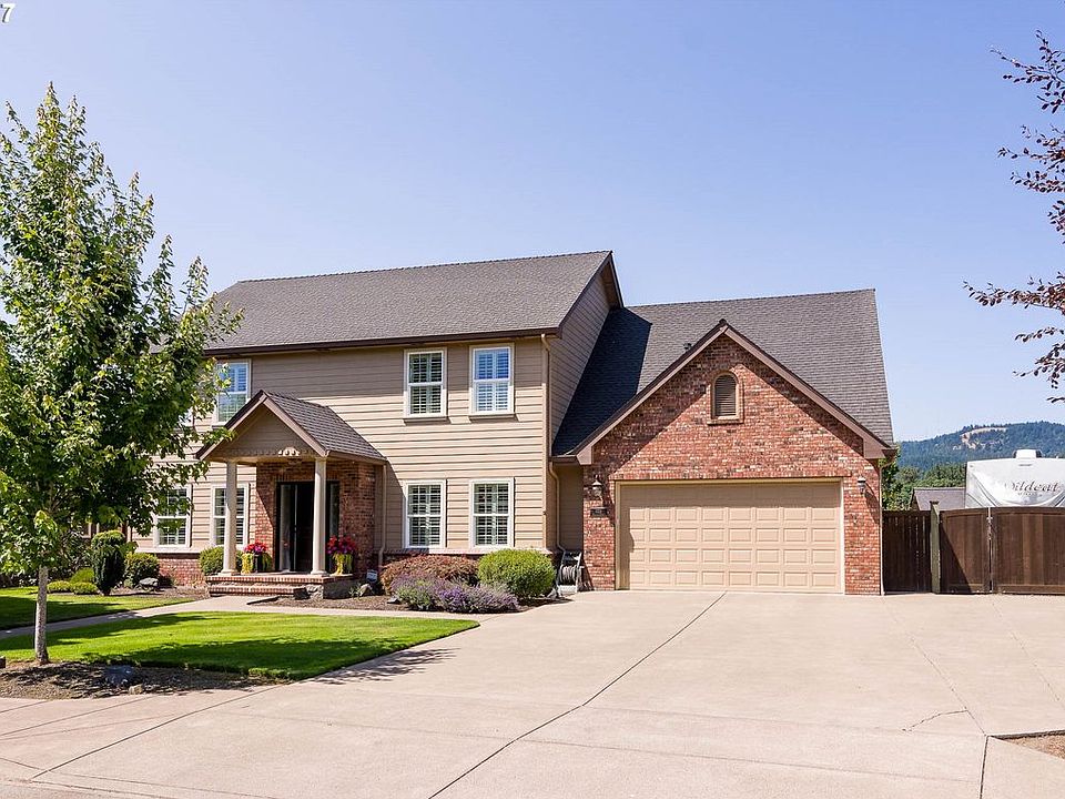 Beautiful orchard and mountain views await you from almost every window in this well maintained home. This traditional floor plan has four large bedrooms and the master suite has it's own private sitting nook. Mature yard with plum and apple trees, a great tool shed workshop and a basketball court. Spend your evenings sitting outside enjoying the view, or take a walk through the orchard to the McKenzie River. Unbelievably gorgeous views