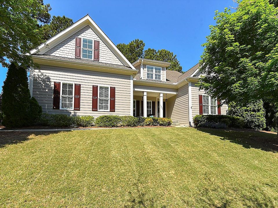 Nestled on a wooded lot, this meticulously maintained ranch plan in sought after Heritage will take your breath away the moment you walk through the door. Soaring 10 foot ceilings greet you in this airy open plan with ALL BEDROOMS on 1st floor. Upgraded cabinets, gas range, granite counters, breakfast bar & under cab lighting complete the gourmet kitchen overlooking a generous living room w/custom built-ins flanking the fireplace. Primary bedroom retreat boasts hardwood floors, en-suite bath with granite counters, built-in bench & spacious walk-in closet. HUGE 2000+ square ft unfinished attic has energy saving Tech-Shield roof decking, rough-in plumbing, and ample potential for future finished space. Custom touches abound with granite counters in all baths, solid oak hardwood floors throughout, crown/trim and custom plantation shutters. Relax in the wooded serenity of the low maintenance yard with screened porch and concrete patio. Located one block from stocked fishing pond and near miles of wooded greenway trails, pocket parks and two community pools. Heritage Golf/Swim/Fitness/Tennis membership available.