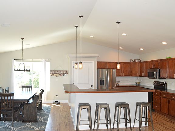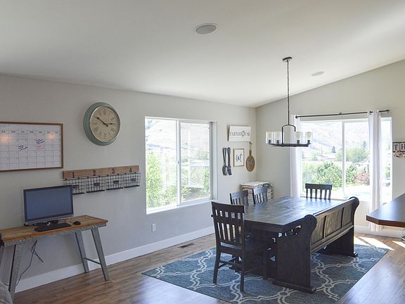 Spectacular River & Mountain Views and all main living on the main floor! Vaulted Living Room to enjoy the views and includes Surround sound. Large Kitchen with Island/Pantry/Stainless steel appliances overlooks dining room. Master Bedroom on main with Master Bath has Dual Sinks & Jetted Tub. Staircase lighting leads to the downstairs with oversized Family Room(Projector & Screen included), 2nd, 3rd & 4th bedrooms. New paint on lower level and new carpet throughout! 2 car garage and 3rd covered parking stall, decorative stamped concrete driveway and entryway.