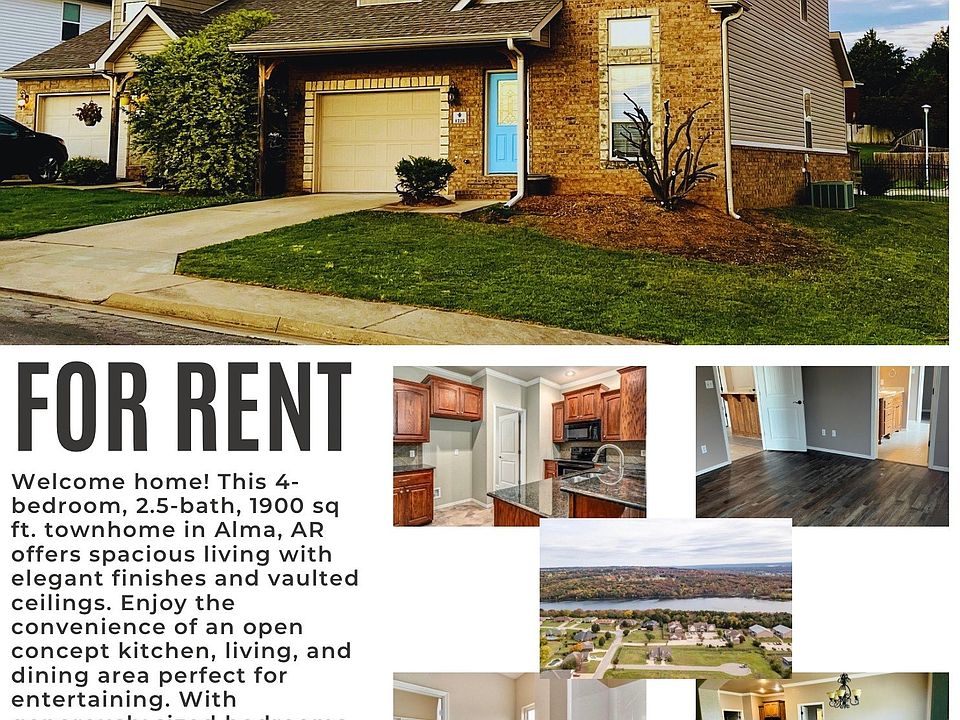 Welcome home! This 4- bedroom, 2.5-bath, 1900 sq ft. townhome in Alma, AR offers spacious living with elegant finishes and vaulted ceilings. Enjoy the convenience of an open concept kitchen, living, and dining area perfect for entertaining. With generously sized bedrooms and a prime location, this rental offers both comfort and accessibility in the heart of Alma. First month rent and security deposit due at signing. No smoking allowed.