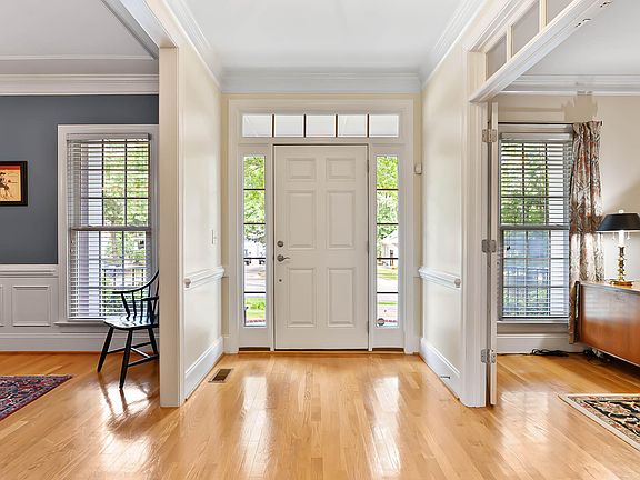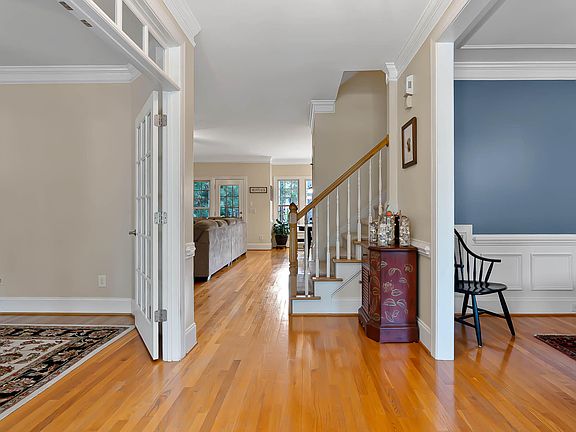 Welcome to this beautifully maintained 4-bedroom, 2.5-bath home offering 2,800 square feet of living space on a landscaped 0.30-acre lot in the sought-after Heritage neighborhood of Wake Forest, NC. With timeless curb appeal, the home features a stately brick front and durable fiber cement siding, complemented by lush gardens and a fenced backyard oasis. Step into a warm and inviting foyer with gleaming hardwood floors that flow throughout the main level. To the left, French doors open to a private home office with a transom window, while to the right, a formal dining room is enhanced by crown molding and chair rail details—perfect for hosting elegant dinners. The heart of the home is the open-concept family room with a cozy gas fireplace, seamlessly connected to the kitchen and screened porch—ideal for indoor-outdoor entertaining. The chef's kitchen is equipped with wooden cabinetry, granite countertops (2023), a ceramic tile backsplash, stainless steel appliances, farmhouse sink with upgraded faucet (2023), and a center island with bar seating. A built-in desk with glass display cabinets adds charm and functionality. An updated half bath (2019) and walk-in pantry are conveniently located just off the kitchen. Upstairs features NEW carpet (2025), a spacious bonus room, and four well-appointed bedrooms. The serene primary suite includes access to a private balcony, a walk-in closet with custom shelving, and a luxurious ensuite with dual vanities, a soaking tub, and a tiled walk-in shower with glass door. The secondary bedrooms share a stylish hall bath with a double vanity and subway-tiled tub/shower combo. Enjoy the updated laundry room's thoughtful design with a subway tile accent wall, custom cabinetry folding station, and utility sink (2020). Additional storage or expansion opportunities await in the walk-up attic. Outside, the screened porch with ceiling fan overlooks a manicured yard enclosed by an iron fence, while a brick patio offers space for al fresco dining. The brick patio and professionally landscaped yard are enhanced by flood lights, landscape lighting, and a full lawn irrigation system—perfect for enjoying the outdoors day or night.The oversized 2-car garage features epoxy flooring (2025) and finished drywall. Additional upgrades include asphalt roof (2021), brick walkway from garage to patio, exterior paint (2017), new tile and tub in second floor bathroom (2017). This home blends traditional elegance with modern upgrades in one of Wake Forest's most desirable communities—don't miss the opportunity to make it yours.