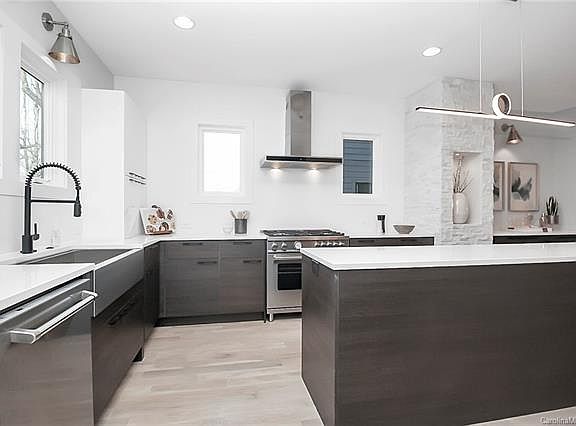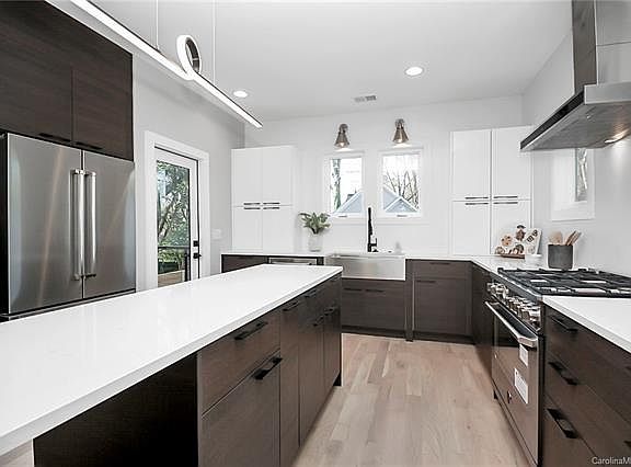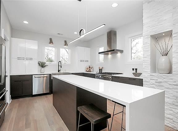 Brand new Modern duet townhome located where Plaza Midwood, Villa Heights and NoDa neighborhoods meet. Over 2,800 square feet of expansive living area PLUS a 2 car garage and a private backyard. Modern, timeless, and high-end fixtures and interior selections throughout; Bertazzoni appliances with 36" range, waterfall quartz island and dry bar off the kitchen. Beautiful true hardwood floors accentuate the living space. Metal handrails with step lighting on the stairs illuminate each tread. Townhome has an incredible open concept that makes it feel like you're in a single family home. Lower floor has a bedroom and full bathroom off of the foyer and garage. Main floor includes the kitchen, dining, and living. Upper floor you will find the Master suite conveniently attached to the laundry room plus an additional guest bedroom and full bath. Top floor includes a rooftop terrace with a large bonus room.