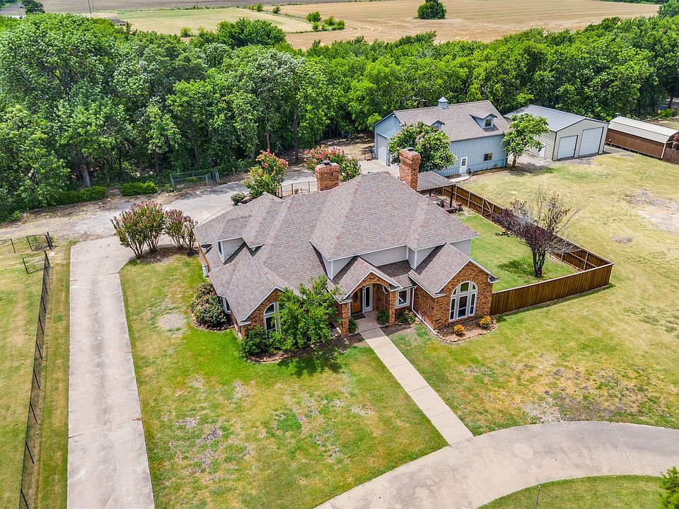 Beautiful home on over two picturesque landscaped acres in Van Alstyne! This gorgeous property has no HOA, is outside city limits and has something for everyone: a HUGE 36x45 Morton building complete with 3 large overhead doors, side door, electricity & plumbing, Texwin 2020 RV boat storage building, fenced-in side yard, additional fenced-in space for chickens or other animals, and even a HUGE swimming pool with a covered back patio for relaxing and entertaining. The inviting home is bright with natural light with all downstairs windows just replaced last year! Primary bedroom is downs, two cozy fireplaces, wonderful flex room can be used as a second living room, game room, or whatever you want it to be. Three secondary bedrooms up as well as a balcony overlooking the pool. Kitchen has SS appliances, pot filler, gas cooktop & double ovens! This gorgeous lot features a tree-lined creek on the south side of the property. Come see this slice of heaven!