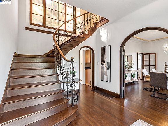 Exquisite period estate exudes history and charm. Amazing entertainer floor plan with oversized great room and attached old Hollywood parlor/bar area with access to outside courtyard. Private dining room, breakfast room, private catering area, large kitchen. Enjoy the huge lush grounds or one of several courtyard and patio spaces. One full bed and bath on main level. Impressive original grand staircase greets you in the large foyer. Too many period details to mention. Original lighting, original bathrooms, original hardwood, arched windows-history abounds. Large upper level patio off of one of the bedrooms, en-suite off of front bedroom. Primary suite has sitting area, huge closets, dressing area, original bathroom and private patio overlooking front yard and hills view. Elegant and tasteful, but leaving room for your personal touches.