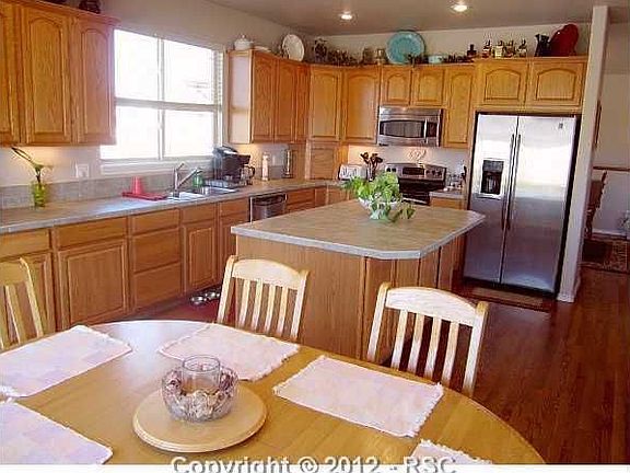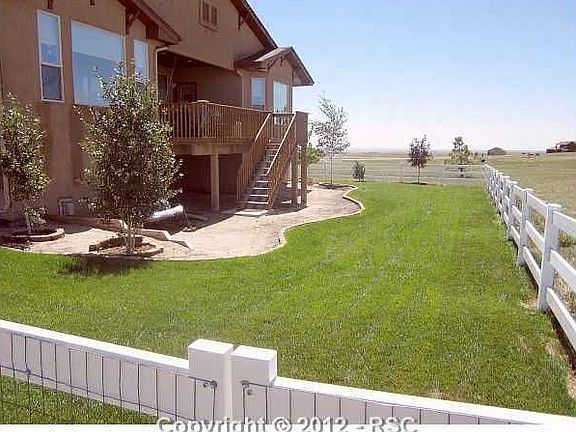 Very sharp stucco 4 br 3 ba, 4 car garage. Resale that backs to west with great Pikes Peak View. Spacious kitchen with island, FD and walk out to 18x15 partially covered trex deck. Spacious master br with walk in closet, Jetted tub & seperate shower. Basement is garden level with 9 ft ceilings, wet bar and entertainment center. Main level office. Hardwood in kit, din room and entry. Zoned for horses.