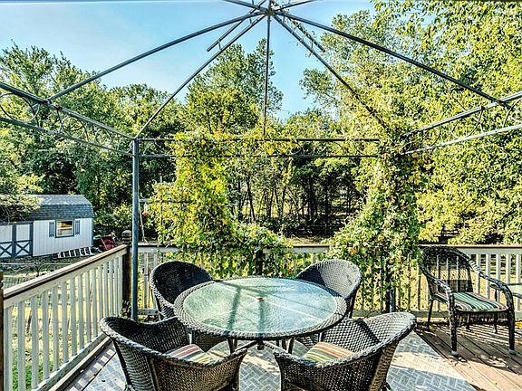 REMODELED TO PERFECTION from top to bottom, this home is STUNNING! Sitting on almost a full acre surrounded by trees, this property provides such a wonderful tranquil setting to call home. Warm wood floors adorn all living spaces and two of the bedrooms. The open floor plan coupled with a light, bright color palette and great natural light creates a warm, welcoming place to gather with friends and family. The perfectly appointed kitchen was reconfigured to open it up making it a much more chef friendly space. There is a lovely sunroom that provides a cozy area to enjoy your morning coffee, an afternoon reading break and your favorite evening beverage. The spacious primary bedroom has a sitting area and ensuite bathroom with decorator tile flooring, double vanity, shower, whirlpool and walk-in closet. One of the secondary bedrooms has a Murphy bed that makes the room a great flex space! The backyard has a great deck with climbing Morning Glories, TONS of room to run and play, storm shelter, and a spacious storage shed. The property extends beyond fenced area. See supplements for approx boundaries.