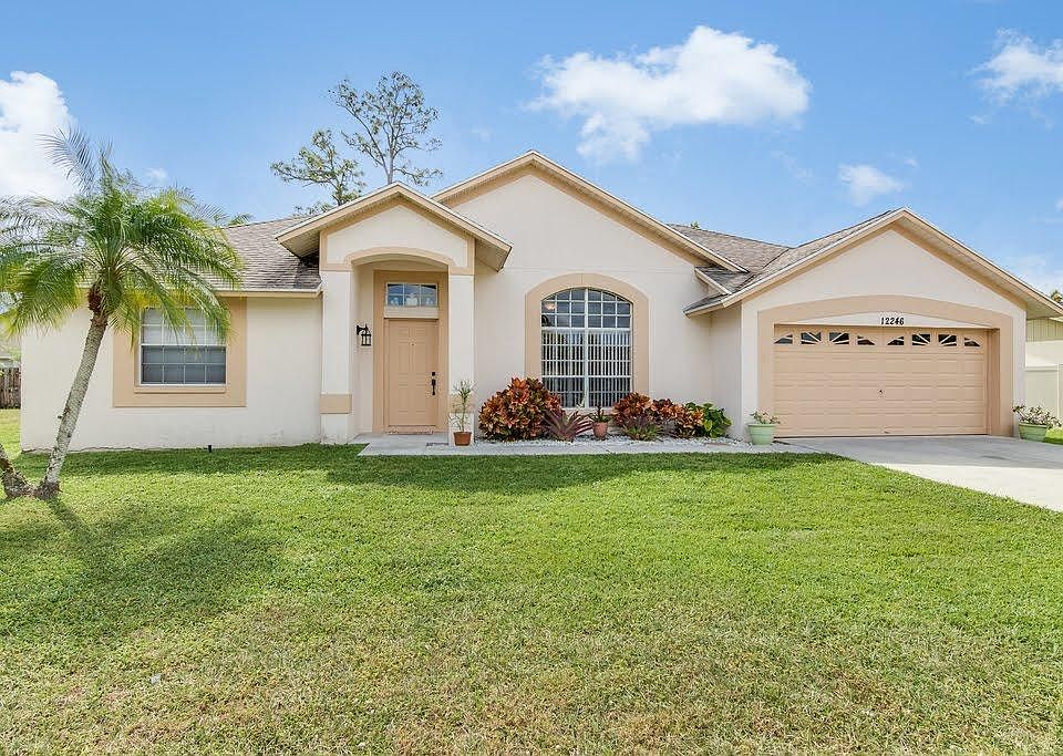 Pristine updated 3 bedroom 2 bath home on quiet cul-de-sac in Pinewood East of Wellington with NO HOA! New gourmet kitchen offers granite counter tops with overhang adding additional seating, stainless steel appliances, pullouts in cabinets, pendelum lighting, under mount lighting. Large open floor plan includes tiled formal living and dining rooms and an additonal family room off the kitchen. Split bedroom plan. Master includes laminate flooring, dual closets and dual sinks in master bath! Two additonal bedrooms and bath have laminate flooring as well. Sliding doors open to a welcoming patio which leads to the gorgeous, open backyard kept nicely shaded by a large, tropical Brunfelsia. Plenty of room for a pool! Screened in, partially covered patio includes a large hot tub for relaxation!