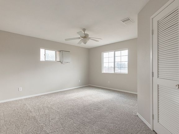 This Beaumont home offers a two-car garage, an in-ground pool, ceiling fans, Corian kitchen countertops, gas heating, a walk-in master closet and a master bathroom with a tile surround shower.