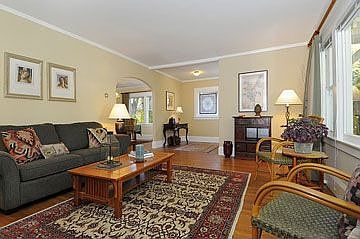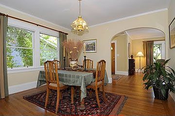 This welcoming bungalow has a heart-of-the-home kitchen - a bright and sun-filled room with both an informal dining area and an island eating bar. French doors open from the kitchen to the secluded entertainment deck (perfect for morning coffee in the sunshine, an evening barbecue or parties with friends) and the extraordinary, lushly landscaped garden. The adjacent formal dining room has a built-in china hutch. The generously proportioned living room has built-in book shelves and an attractive fireplace with display mantel. The floorplan for the bedrooms allows for privacy and sound separation; both bedrooms feature spacious closets and the rear bedroom has private access to the garden and deck. The inviting front porch and entry foyer create a gentle transition from the outside environment to the interior of the home.