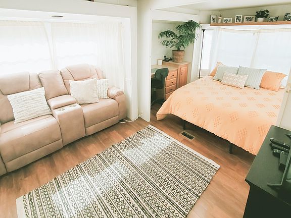 So cute! Enjoy this home as a winter getaway or year round! The seller is including additional AC units for the summertime! Dixie Downs is a fun 55+ community with 2 clubhouses and indoor swimming pool with shopping and restaurants nearby. The second bedroom/flex room could be used in multiple ways, including a guest room, office, or dining area, add a closet rod above the desk to hang your clothes. This lot includes 2 storage units, including one large one for the private laundry facilities and a brand new water heater. Buyer can assume the contract for the new propane tank. Very clean and ready to move into. The sellers have loved this home as their weekend getaway, they just want a bigger, more permanent second home now.