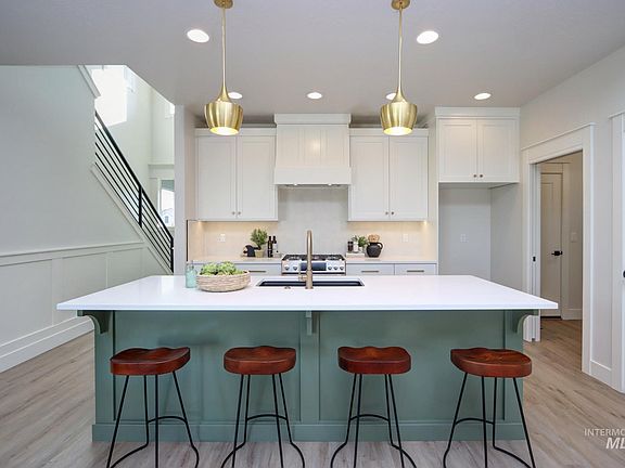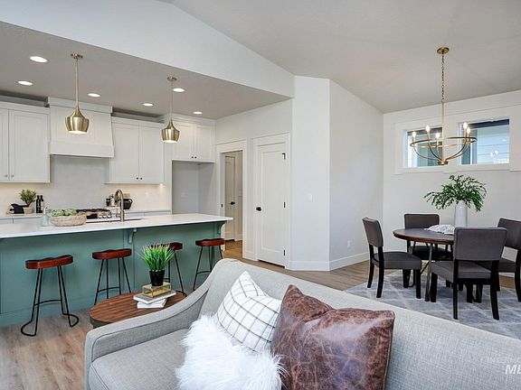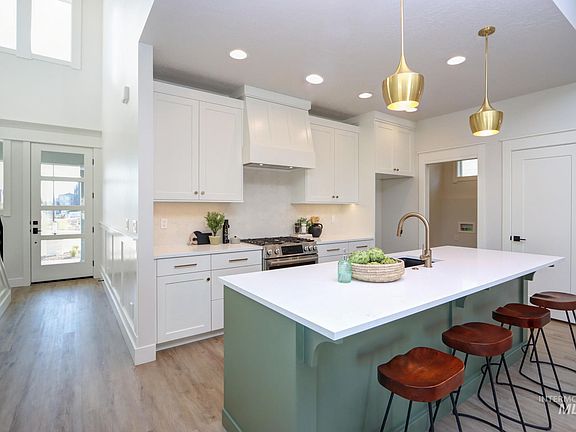 MOVE in ready-Photos are of this home. Literally found at the middle of everything the Treasure Valley has to offer fun & minutes from shopping, delicious dining, health club, thrilling entertainment, TOP Golf, movies, medical facilities, I-84 as less than a mile to The Village at Meridian! Is a brand new floor plan having 4 bedrooms with two suites on main level will delight given the natural separation and privacy from the upstairs bedrooms and bath. Experience award winning design as seen in the kitchen complete with stainless steel appliances-5 burner cooktop oven/range, microwave and dishwasher. The butlers pantry has storage galore, even a countertop to hide appliances. Stunning interior architecture as seen in the varied ceiling heights, window size and dramatic and extensive moldings. ALL cabinetry is custom built having soft close doors and drawers. Quartz, Tile & LVP surfaces throughout. Garage comes finished and insulated with opener. Full vinyl fencing.