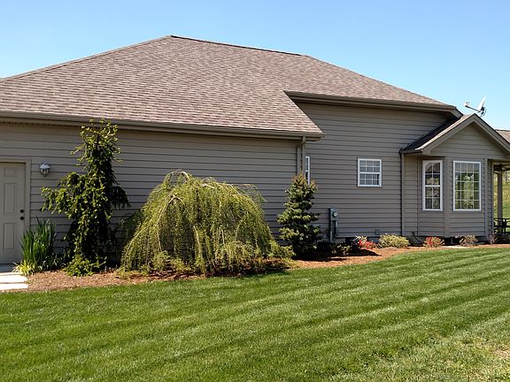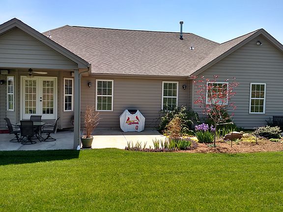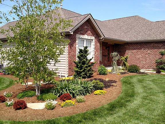 Back on Market! Stunning custom built home with all upgrades, extensive landscaping by Private Gardens, full large brick front with stone, insulated 6" siding, sprinkler system, full sod yard, buried gutters to street, covered patio/w ship plank ceiling and extra open patio, additional outside lighting, oversized 3 1/2 car garage insulated and finished, insulated garage doors with side service door, work bench and cabinets, hardwood floors, ceramic tile in bathrooms and laundry room, carpet in bedrooms and living room, Maple 42" cabinets w/crown molding, breakfast bar, custom bar with euro rolled edges - Jenn-Air downdraft range, Stainless Steel appliances, custom backsplash, Moen faucets, double vaulted ceiling in great room/kitchen, bay windows/French doors in kitchen, expansive amount of natural light, custom window treatment, surround sound in family room, speakers in garage/patio/master bed and bath, ceiling fans, craftsman doors, open staircase w/wrought iron spindles, fiberglass front door, master bedroom vaulted ceiling, walk-in closet, luxury master bath w/garden tub and shower, adult height vanities in both baths, laundry room, water softener, full bath rough-in basement, will pay Buyer's Agent Fees 2.5%