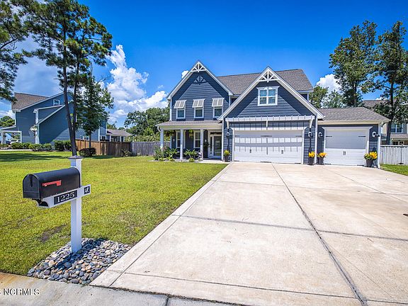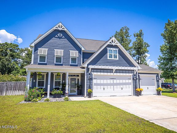 Craftsman, coastal architecture at its finest in the desirable Middle Sound Loop area! Inside you will be welcomed through a large foyer that leads you to the formal dining room, featuring a coffered ceiling and wainscoting. The spacious kitchen showcases beautiful white and gray cabinetry, quartz countertops, mosaic tile backsplash, pendant lighting, and a wet bar, which is perfect for coffee lovers. The living room is set off by a double-sided fireplace, crown molding, and a bookcase. On the other side of the fireplace, you will find the sunroom which lends great natural light and features another coffered ceiling. The downstairs bedroom is perfect for an office, craft room, or guest suite. Upstairs, the spacious master bedroom features a tray ceiling, large walk-in closet and the on-suite bathroom displays separate vanities, a subway tile shower, and subway tile surrounded tub. Three additional bedrooms, a bathroom, and the utility room complete the second floor. The entire third floor is walkup attic storage, which could potentially be converted into a room. As you step outside, you will enter your own private backyard oasis! The fenced in area is perfect for entertaining- soak in the hot tub, cool off in the above ground pool, or just relax with a cup of coffee or glass of wine on the 15x41 custom Trex deck under the lighted pergola. Winds Harbor is located in the highly sought-after area of Middle Sound Loop, which is minutes from Pages Creek Reserve, Ogden Park, Porters Neck, Mayfaire and Wrightsville Beach. This home truly has it ALL!