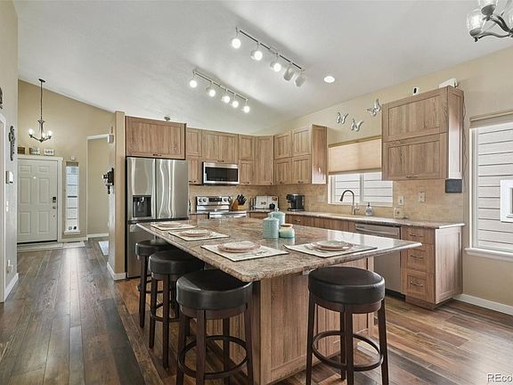 Come find what you love most about this ranch home with a finished walk-out basement & tons of new & newer! Gorgeous reclaimed wood-look flooring stretches from the entry through the kitchen. Remodeled custom kitchen with Euro cabinets, S/S appliances, a queen-bed-sized island WITH cabinets underneath & enough space to serve food & still have room to sit! The family room offers space for larger furniture sets/TV and leads to the French doors that go out back to the deck – this home is perfect for entertaining! The primary suite is over-sized, has a walk-in closet and is coupled with a remodeled, spa-like 5-piece primary bath! There are two more bedrooms on the main floor, a remodeled guest bath, and a conveniently located main floor laundry. The prof. quality finished walk-out basement has a GINORMOUS rec room that is super flexible - big screen, pool table, shuffleboard, kids play area, work-out space... really... WHATEVER! You also get 3 MORE large bedrooms and ANOTHER REMODELED bathroom! Add in the sliding glass door leading to the back yard and you are going to love this place! The back yard also has a shed & the killer fire-pit area! There's still time to BBQ on the freshly painted deck, roast marshmallows around the fire pit & enjoy time outside. The home has central A/C, two car garage with cabinets and shelving, high ceilings, ceiling fans, LOW PROPERTY TAXES (no HOA or METRO DISTRICT) and SO MUCH MORE TO DISCOVER!