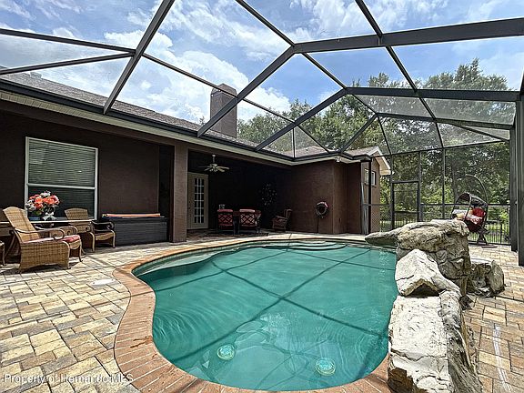 Lovely custom home built in 2007 with 3700 sq ft ( 2773 inside and 956 air conditioned garage ) 5 bedrooms one used as an office, , 3 baths, large open kitchen with granite and custom wood cabinets, screened lanai with swimming pool with waterfall ., Air conditioned oversized 3 car attached garage, all on 1 acre of privacy. Many rooms have high tray ceilings with custom fans, the kitchen is large and some of the custom wood cabinets have glass fronts, built in wine rack, wall oven and microwave. There is an island with a cooktop and stainless steel overhead fan with lights. Custom tile in all the rooms except the bedrooms . which are large and all have walk in closets.