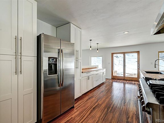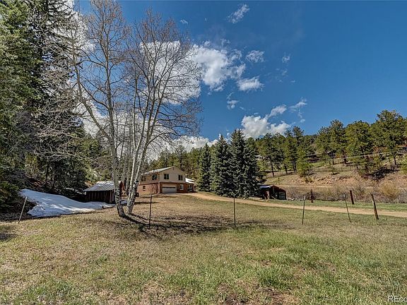 With over 4 Acres and your own slice of Deer Creek running through the property, this 4 bedroom mountain retreat will naturally call to you. The indoor/outdoor spaces flow naturally together with huge picture windows and access to patio from the kitchen to enjoy the sounds of the creek, the lush green yards, and woods to explore. This is truly a nature lover's property. The home has recently had some updates, with a new open floorplan for the main level kitchen/dining area. A beautiful space for cooking and entertaining, the updated kitchen features new cabinets and butcher block countertops, plus new stainless steel appliances. Upstairs are 3 bedrooms - 2 guest rooms and 1 full hall bath plus the master bedroom and bathroom. The lower level features a large living room with wood-burning fireplace and more large windows to enjoy snowy winter days. A 4th bedroom/office and laundry room on the lower level, which walks out to the oversized 2 car garage that has a extra workspace, a workbench and access to the back yard. Unfinished basement has tons of storage space. Large shed off patio, with lots of room for outdoor storage. 2 more outbuildings on the property, can be used as a coop, shed, or other purposes. This creates a small ranch feel, with room for a nice size family, workspaces, outbuildings, natural water running through, woods, and tons of usable space. Property being sold as-is, seller re-locating out of state. Seller is offering a $10,000 credit at closing to provide for new carpet and other finishing touches/updates you want to add. Just 15 minutes to 470 and Kipling, yet in the heart of the foothills, this home is a true mountain escape but not far from the essentials. Move in and make this one yours! OPEN HOUSE SATURDAY 5/6 11am-1pm.