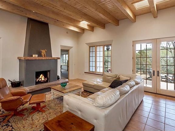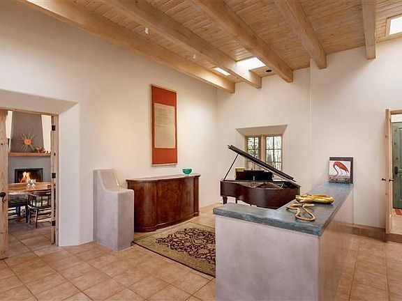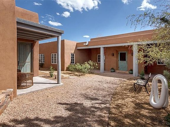 Located on a quiet lane in the close in East side Historic Santa Fe, house and guest house are behind high adobe walls. Enter this compound through antique wood doors that open to a protected courtyard. This light stylish contemporary pueblo has lovely clay paint walls and accents, 18 ft. beamed ceilings and custom fireplaces. The spacious dine-in kitchen opens to a generous covered portal and sun deck. The four distinct bedroom suites are well appointed and perfect for family and guests. The detached guest house designed by Trey Jordan is in perfect harmony with the main house. This extraordinary guest house has a very functional kitchen, fabulous living room with 18 ft. ceilings, bedroom and a full bathroom. Entertaining is perfect in the spacious and private back & front portals. Included is a 2 car garage fully finished and several off street parking spaces. This downtown property is priced to sell.
